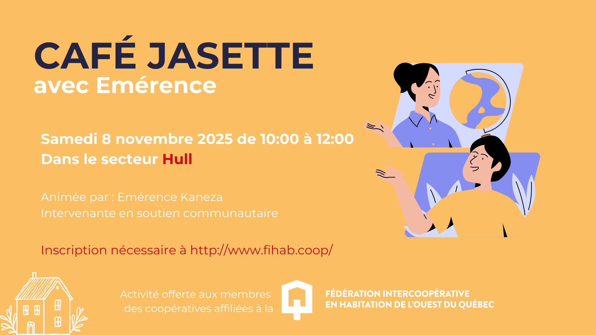 Le café jasette en coop est une initiative portée par la FIHAB, dans le cadre du soutien communautaire offert aux coopératives d’habitation.