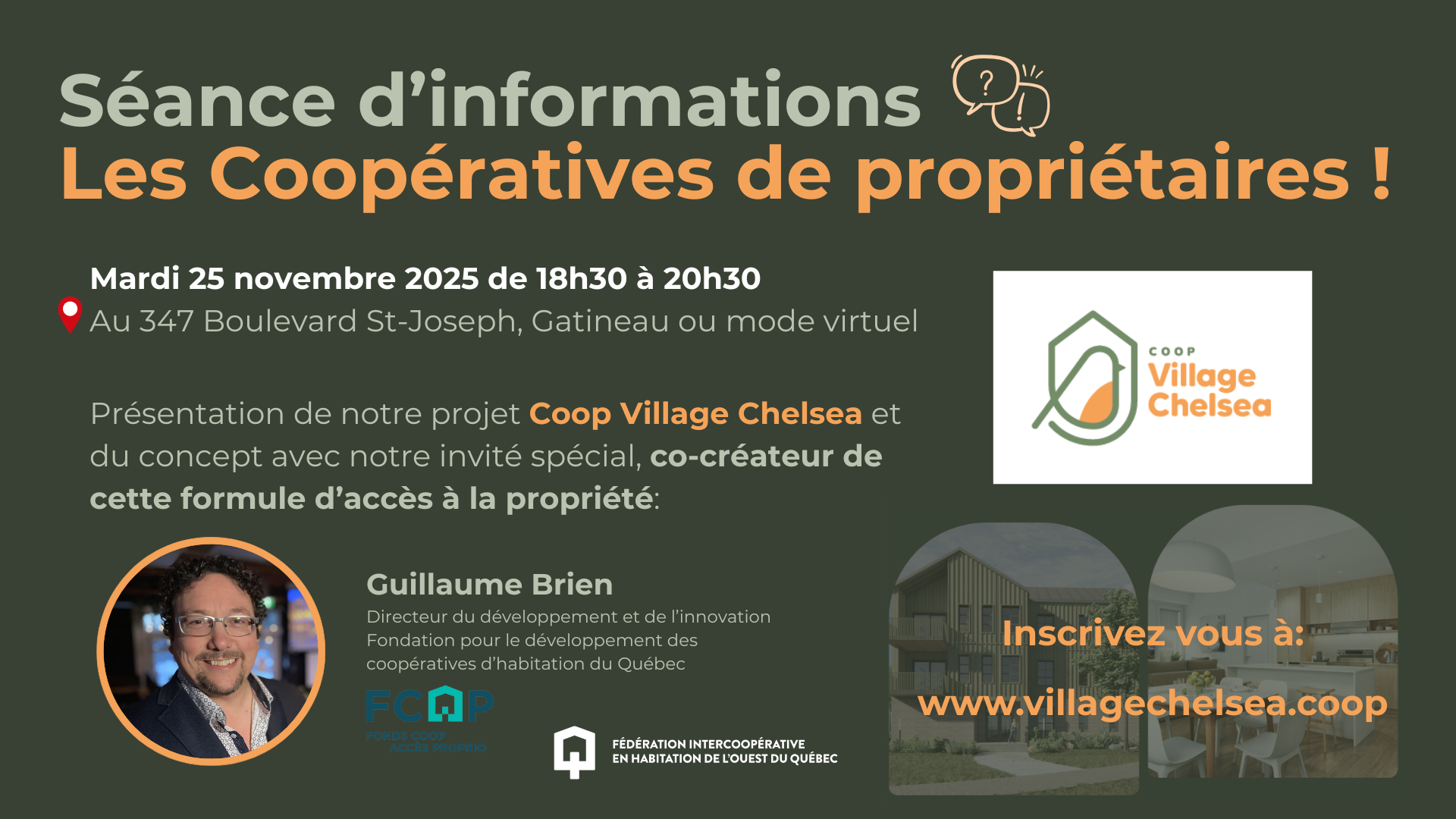 Le 25 novembre prochain, découvrez le concept de Coopérative de propriétaires grâce cette séance d’informations animée par Guillaume Brien, co-créateur de cette formule d’accès à la propriété et Directeur du développement et de l’innovation à la Fondation pour le développement des coopératives d’habitation du Québec !